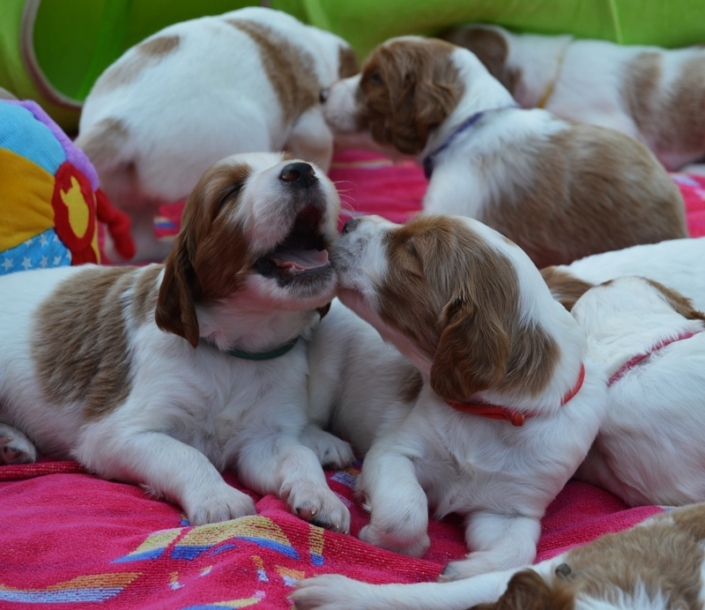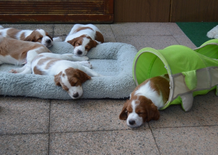 Nun sind unsere Elf schon gut sechs Wochen alt, sie entwickeln sich bestens. Es wird den ganzen Tag gespielt, getobt und mit den Geschwistern gerauft. Florence bespaßt zwischendurch die Kleinen, schön zusehen wie toll die junge Hündin mit den Welpen umgeht.